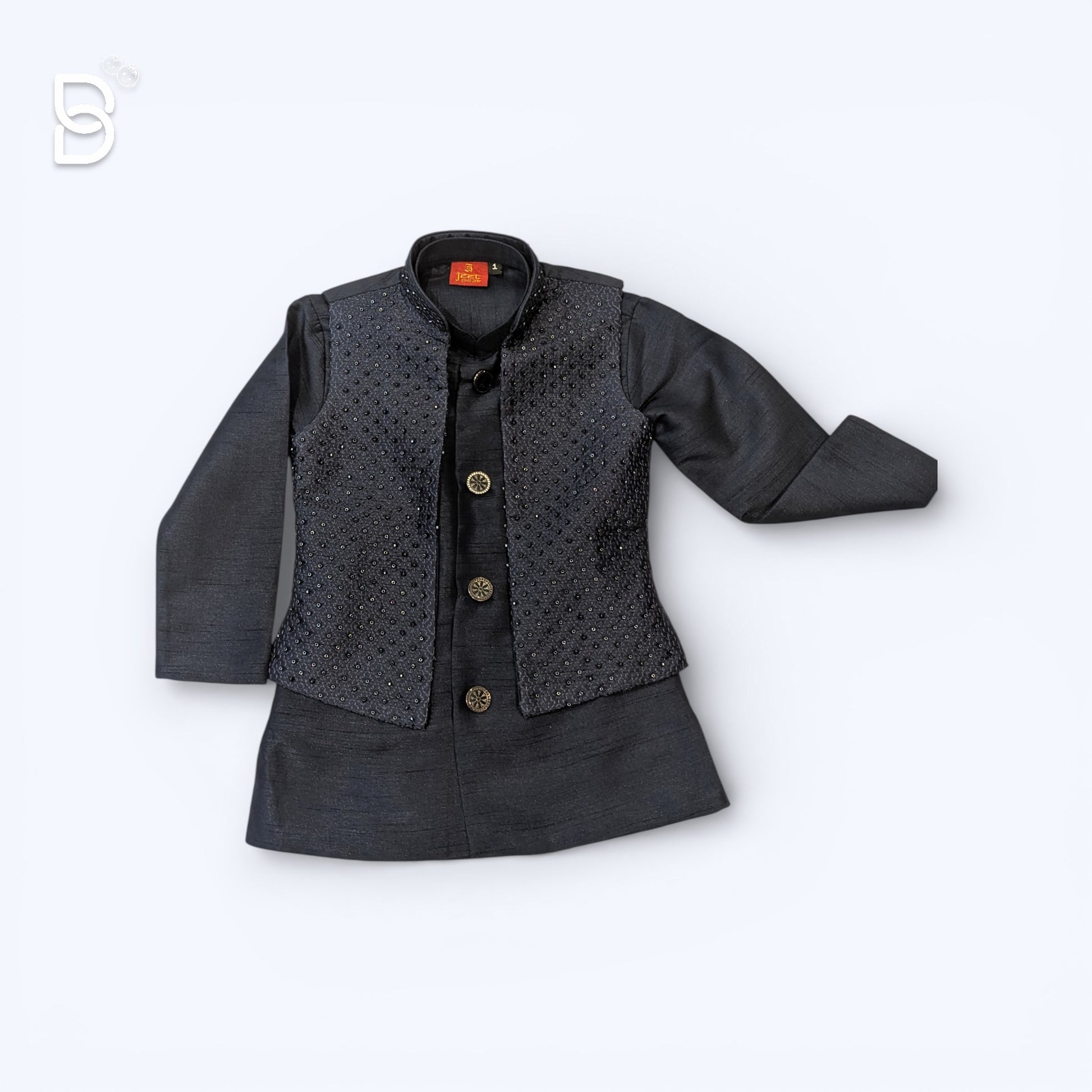 Sophisticated 3-Piece Set: Includes a long-sleeved kurta, matching straight-fit pajamas, and a premium Nehru-style waistcoat. Exquisite Detailing: The waistcoat features intricate tonal embroidery and subtle beadwork/sequin detailing, adding a layer of luxury and texture to the look. Premium Fabric: Crafted from a high-quality silk-blend fabric with a subtle sheen, giving it a rich, festive appearance while remaining breathable. Modern Fit: A tailored silhouette that ensures a sharp look without compromising on movement. Designer Accents: Finished with ornate metallic buttons on the waistcoat for a touch of regal charm.