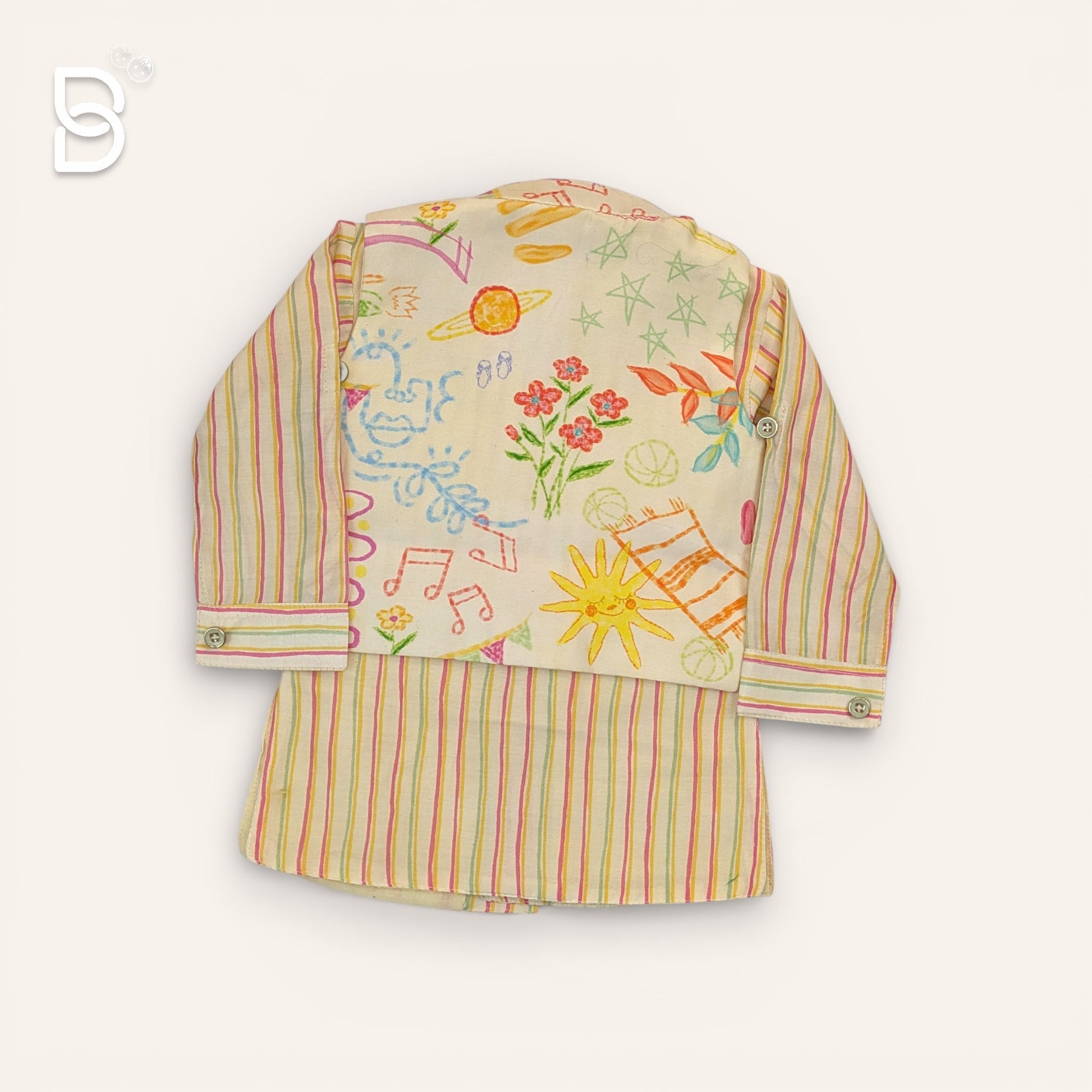 Playful Waistcoat: Features a creative "doodle" style print with musical notes, stars, and floral patterns in vibrant multi-colors.