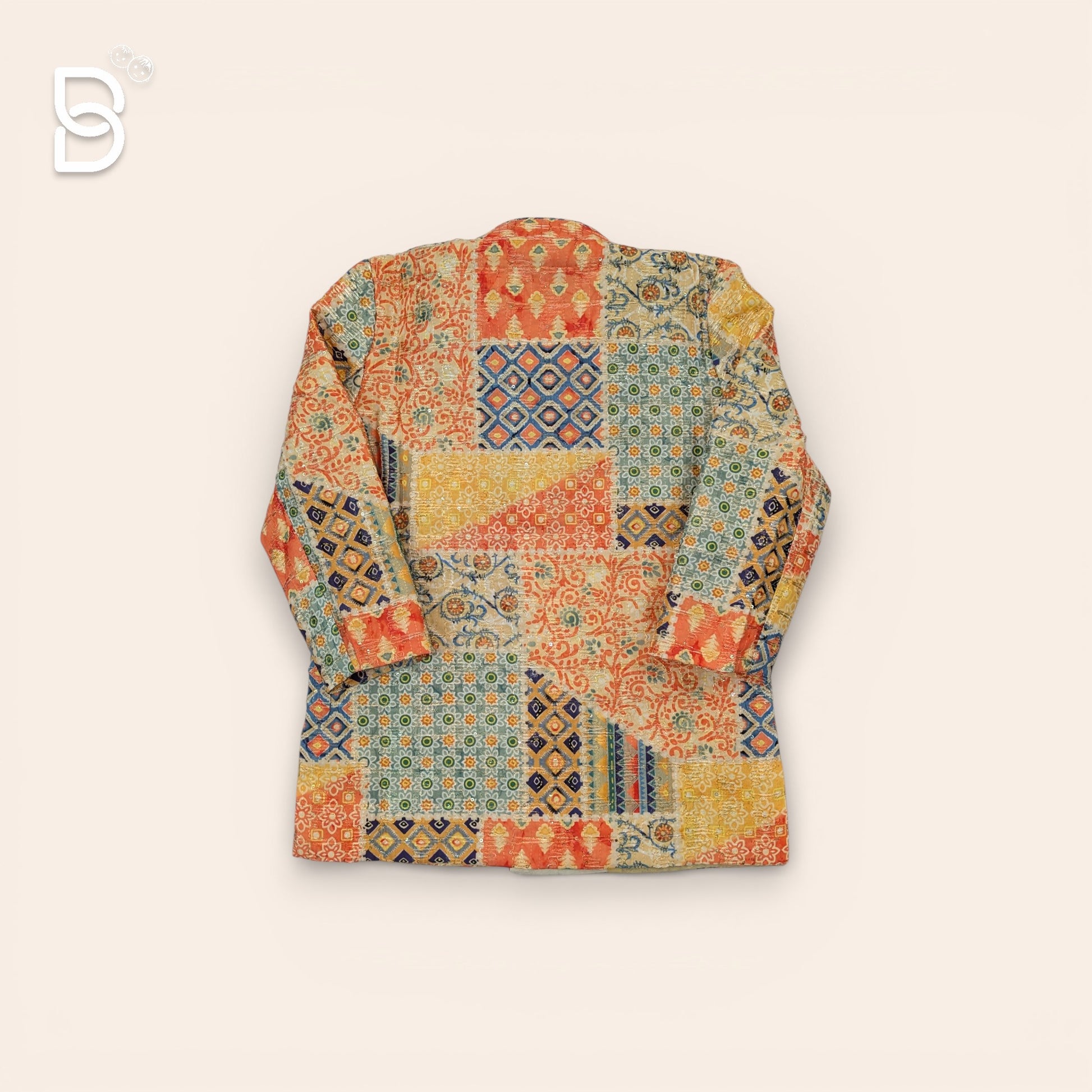 The Kurta: Features an intricate patchwork design in shades of saffron orange, teal, and gold. The fabric is adorned with traditional geometric and floral motifs, finished with an elegant mandarin collar and ornamental buttons.