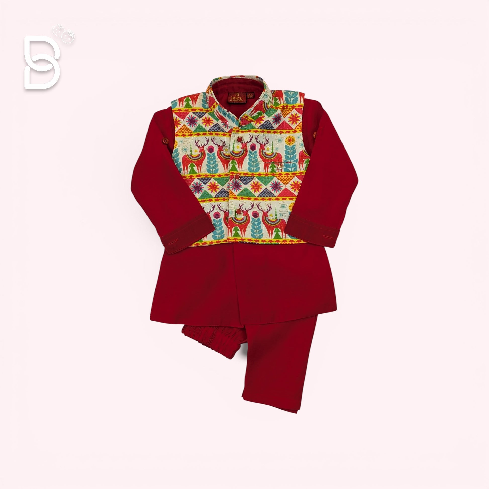 Printed Waistcoat: A colorful vest featuring a unique reindeer and geometric pattern.