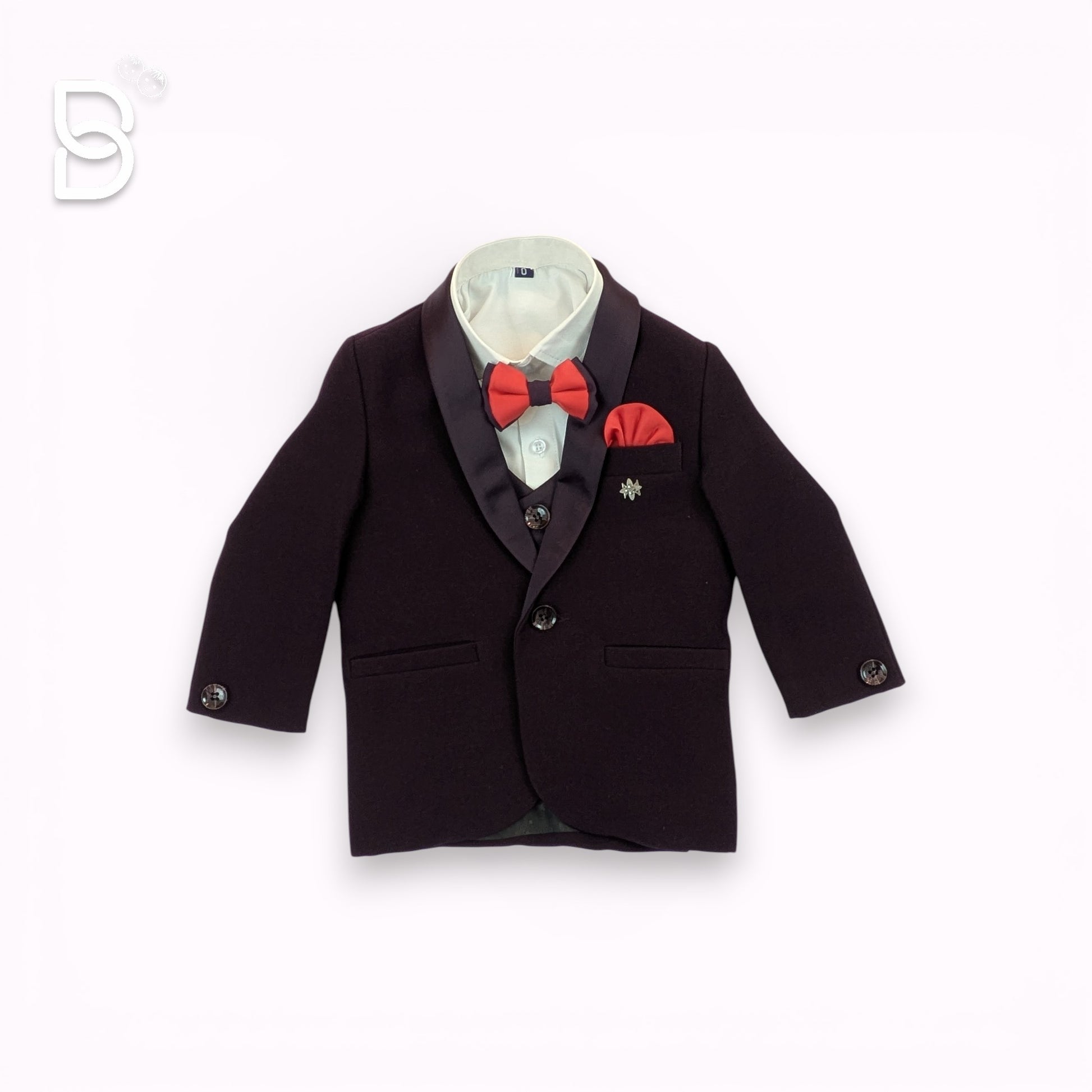 Elevate your little one’s style with this impeccably tailored 4-piece formal set. Designed for the young trendsetter, this suit combines the timeless silhouette of a tuxedo with modern, vibrant accents. The deep wine/burgundy blazer features sleek satin-finish lapels and a matching waistcoat, paired with a crisp white shirt and coordinated trousers.
